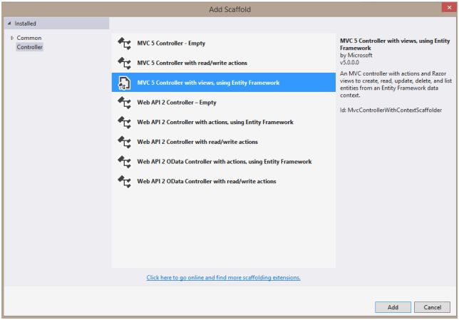 Let us add the controller. Right click on the controller. Add->Controller. Select MVC 5 Controller with the views, using entity framework. Click Add.