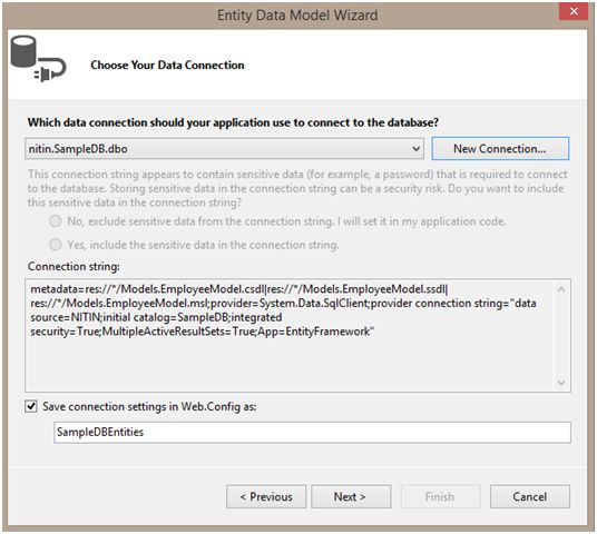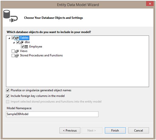 Since we need to deal with the table, we will just select the table. Had there been a requirement for the stored procedure, we would have selected the stored procedure. As of now, we are good to go with Employee table. Click Finish.