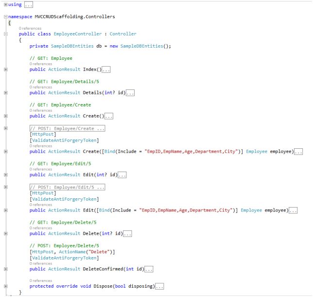 When the controller is created, we can see that it has auto generated code in it. Let us check the code generated by the entity framework scaffolding template.