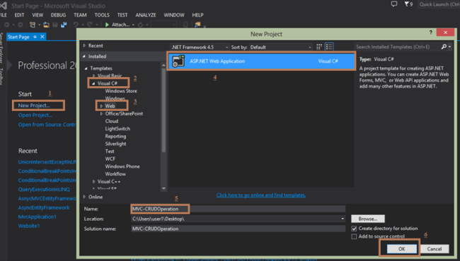 Select New Project -> Visual C# -> Web -> ASP.NET Web Application and enter your application name. Here, I named it "MVC-CRUDOperation". Now, click OK.