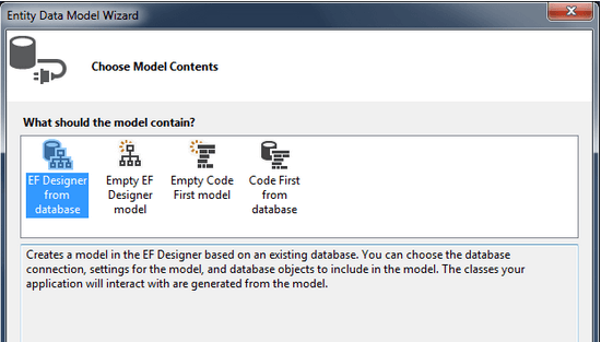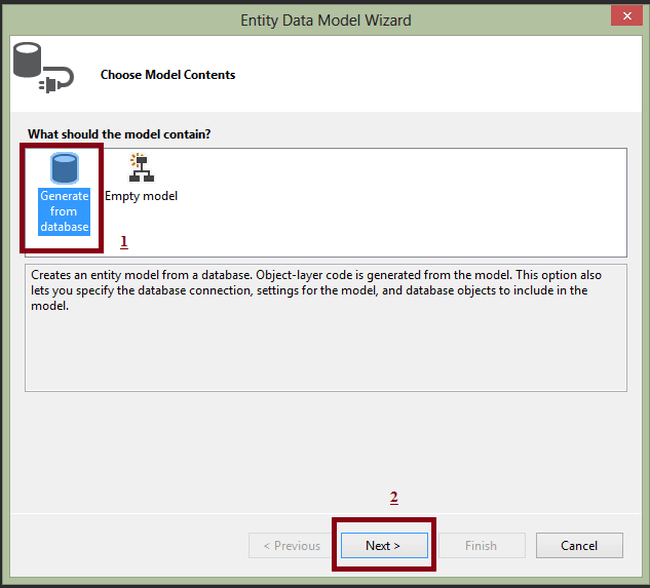 Here, we have an existing database, so we move on to the database first approach. Select "Generate from database," this caption name will be different on each version of Visual Studio. Now, you are seeing it in Visual Studio 2013.