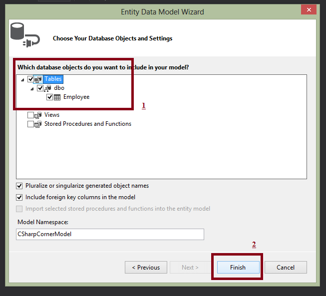 Now, select the table(s) which are needed to be configured with our application through Entity Framework and click Finish.