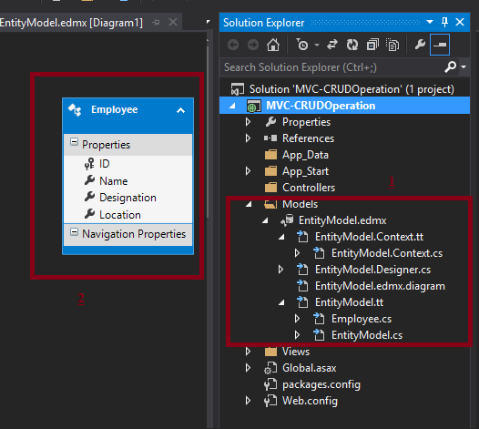 Now, you can see in the below image that the EntityModels are configured with Classes, Properties, DataContext and etc. If you have more than one table, you can easily see the tables with relationships in a .exmx diagram. Here, we have one table only, so there is no possibility to see that.