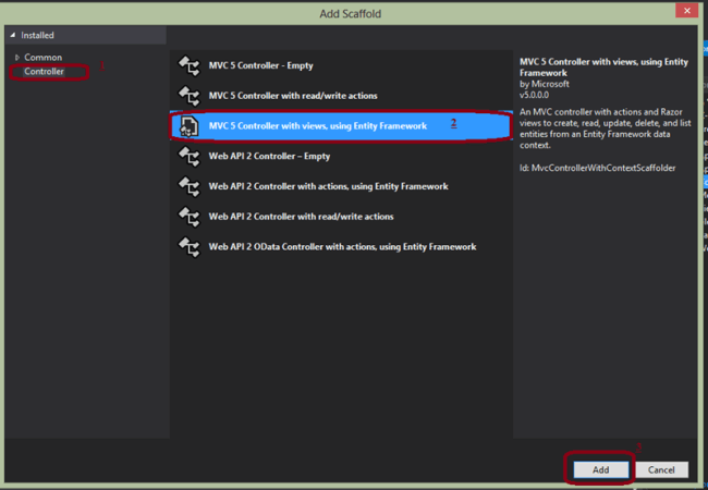 To implement scaffolding Select "MVC5 Controller with views, using Entity Framework" and click add