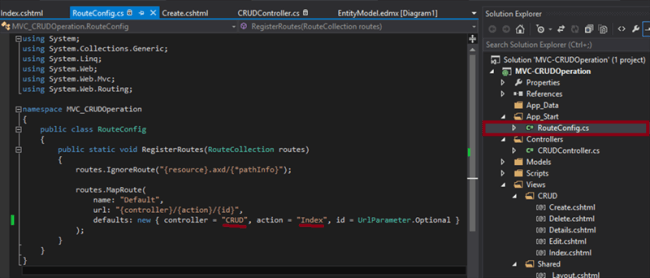Here we need to mention the Homepage, that means we need to mention which controller and which action needs to be executed first. By default it will be in Home and Index, here we created the controller in the name of CRUD so in controller I mentioned the name "CRUD".