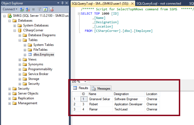 - INSERT [dbo].[Employee] ([ID], [Name], [Designation], [Location]) VALUES (2, N'Subash', N'Software Engineer', N'Coimbatore')