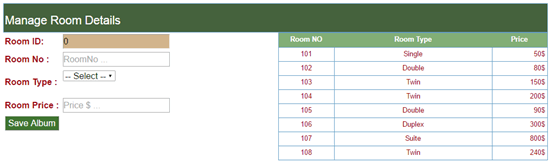 Here, a user can add room details like Room Number, Type, and Price.