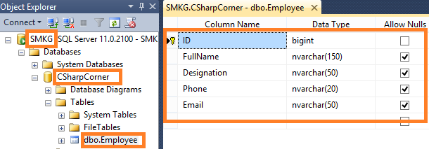 First, we will create a table in SQL Server to populate a Kendo UI grid with data in ASP.NET MVC. I have created a table "Employee" with the following design.