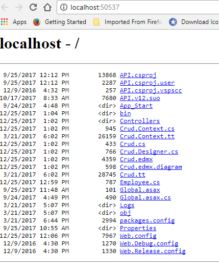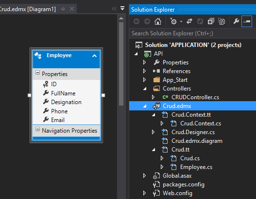 Implement ASP.NET WEB API CRUD Logic Using Entity Framework Without Writing Code And Test It With Postman. While creating the project I named it as "API".Entity Framework implements the database first approach and In Meantime choose our created table with entity framework and configure with SQL table "Employee" from CSharpCorner database and with our API. Once you do those steps your API will be like below,