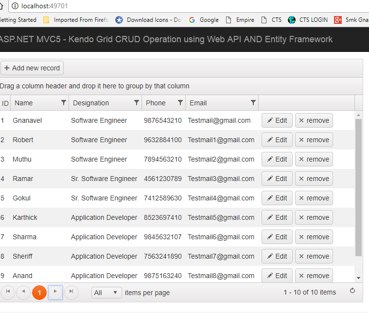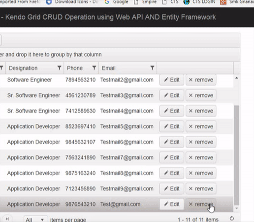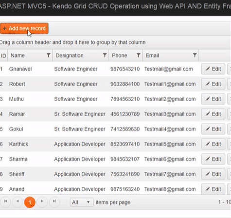 In this article, we discussed how to do the CRUD operation in Kendo UI Grid using ASP.NET Web API and Entity Framework in ASP.NET MVC5 Web Application.