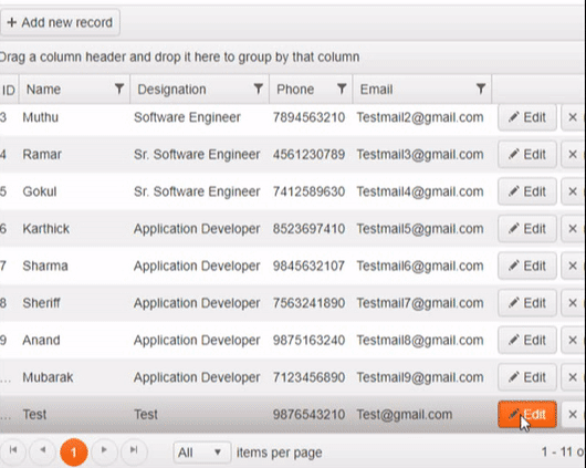 Click Edit button in the respective row of a grid to update existing record in Popup mode.