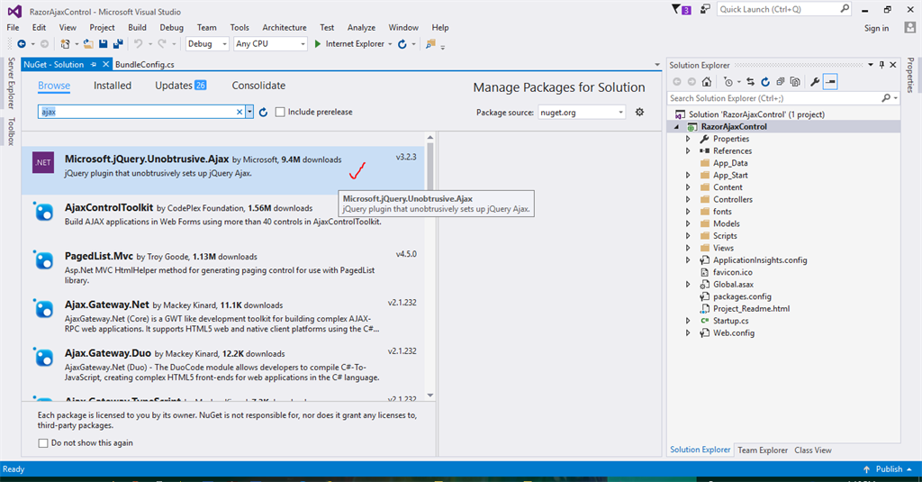 Before we move further in this tutorial, we need to first add jquery.unobtrusive-ajax.js library. To add this library, go to Tools->NuGet Package Manager->Manage NuGet Packages for Solution, followed by searching for jquery.unobtrusive-ajax library and install this library into your project, as shown below.