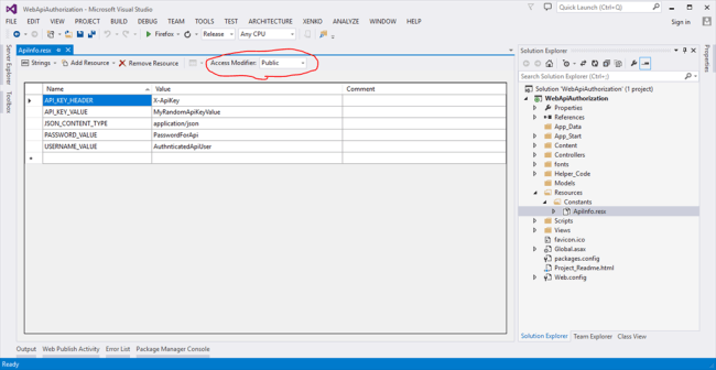 Make sure that Access Modifier is set to Public. This file will contain authorization constants that I will be using to authenticate my REST Web API.