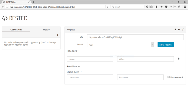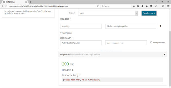 - Let's test out REST Web API in REST Web API client. I am using Firefox plugin i.e. "RESTED". At first, I simply try to hit the REST Web API without any authorization details and I will get the following response.