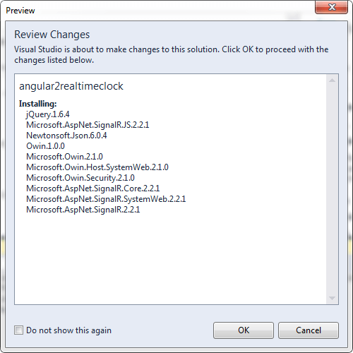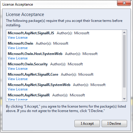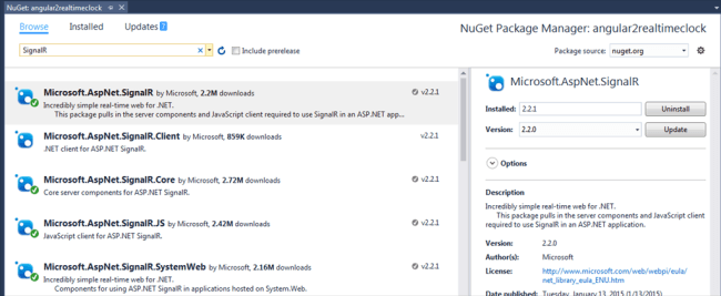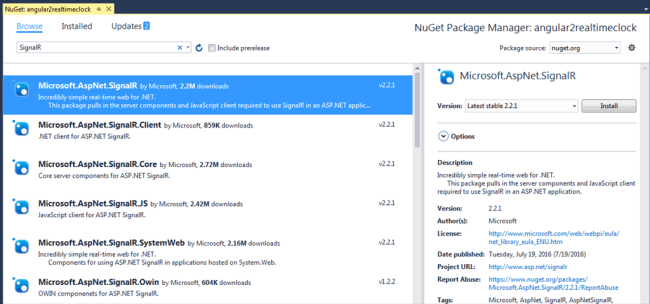 NuGet Package Manager Window opens, search SignalR, press Install button to install the packages.