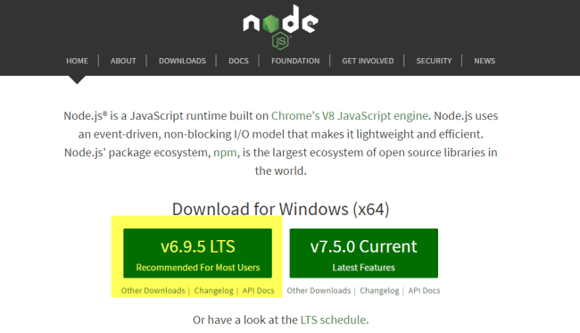 Go to https://nodejs.org/en/ and click on the recommended version to be installed for Windows.
