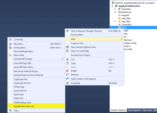 We first create the folder, namely Hubs, and create a Hub Class by right clicking on the folder. Select Add è SignalR Hub Class, name it and it will add hub class to the folder.