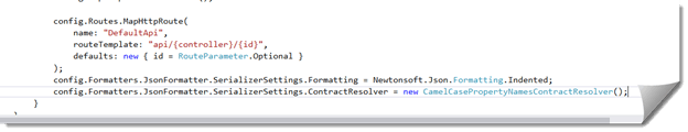 When you look at the data you will PascalCase we want data to be CamelCase.So in our WebApiconfig .cs we add two lines of code as to serialize JSON output and we want camelcase letters as,