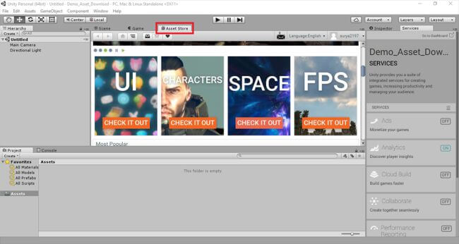 Click the Asset store and it shows the various pre-built assets for the Game development.