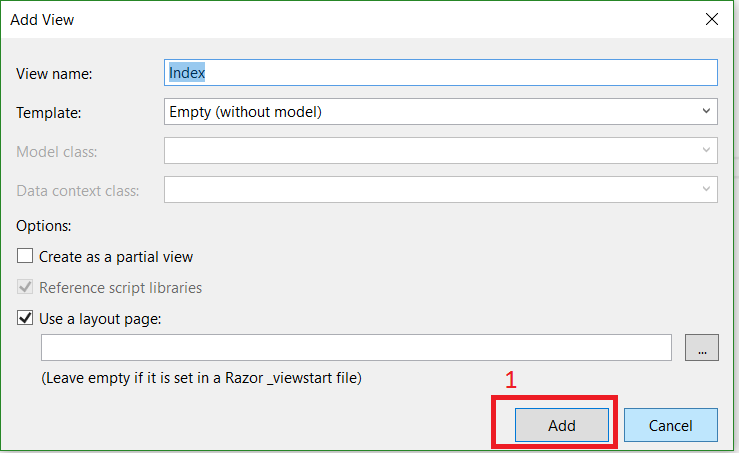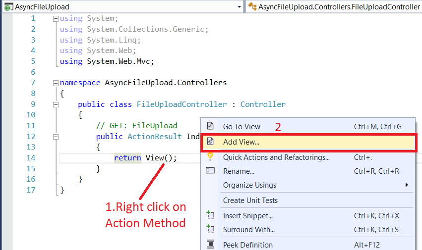 To create a View, right click on respective action method and select Add View. Here, index method is default action method and I am using the same action method.