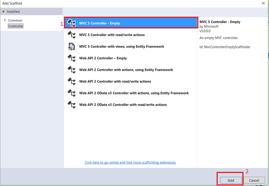 To create a Controller, right click on the Controllers folder under your project, and follow the below steps.