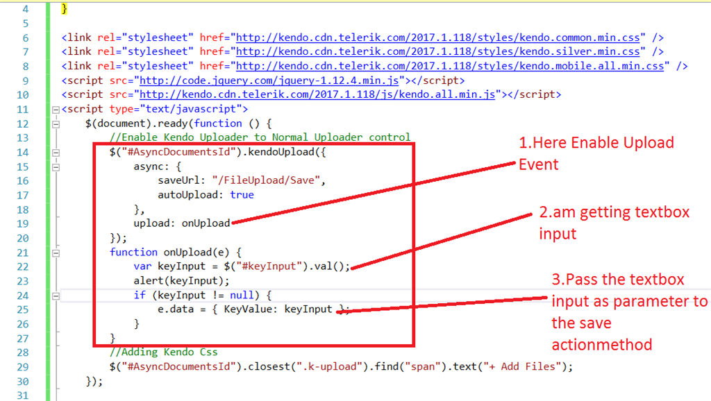 We need to pass this textbox value while uploading the document. So now, I am going to enable the upload event in kendouploader.
