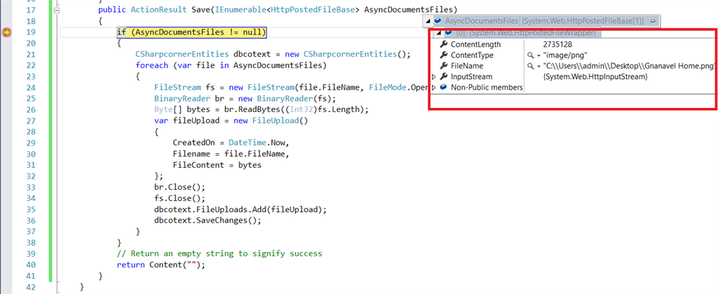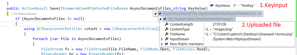 - public ActionResult Save(IEnumerable<HttpPostedFileBase> AsyncDocumentsFiles,string KeyValue)