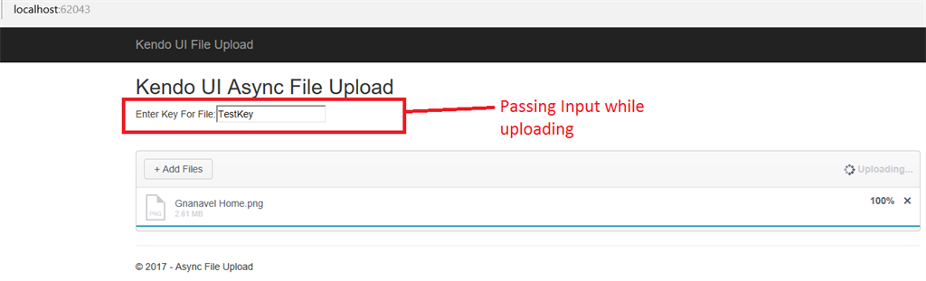 - }); < /script> < h2 > Kendo UI Async File Upload < /h2> < div > < div > Enter Key For File: < input type = "text"