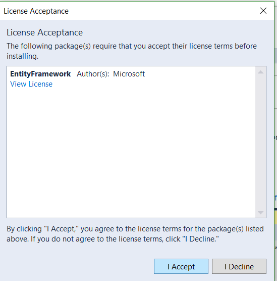 Once you accept the license, the Entity Framework will refer to your resepective project. In the below image, you can see that the Entity Framework has been added in references.