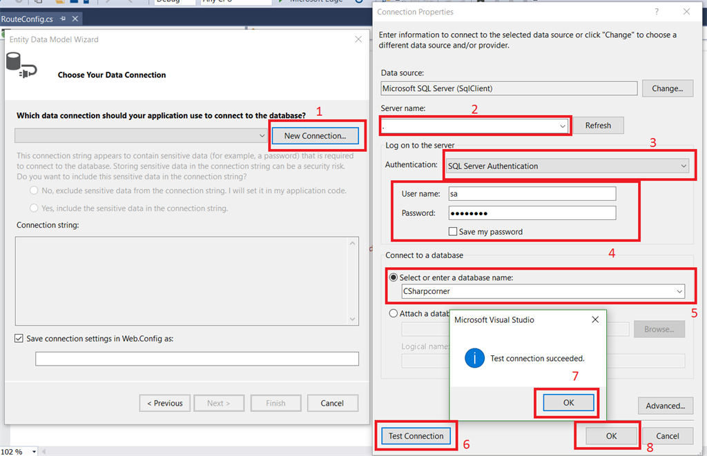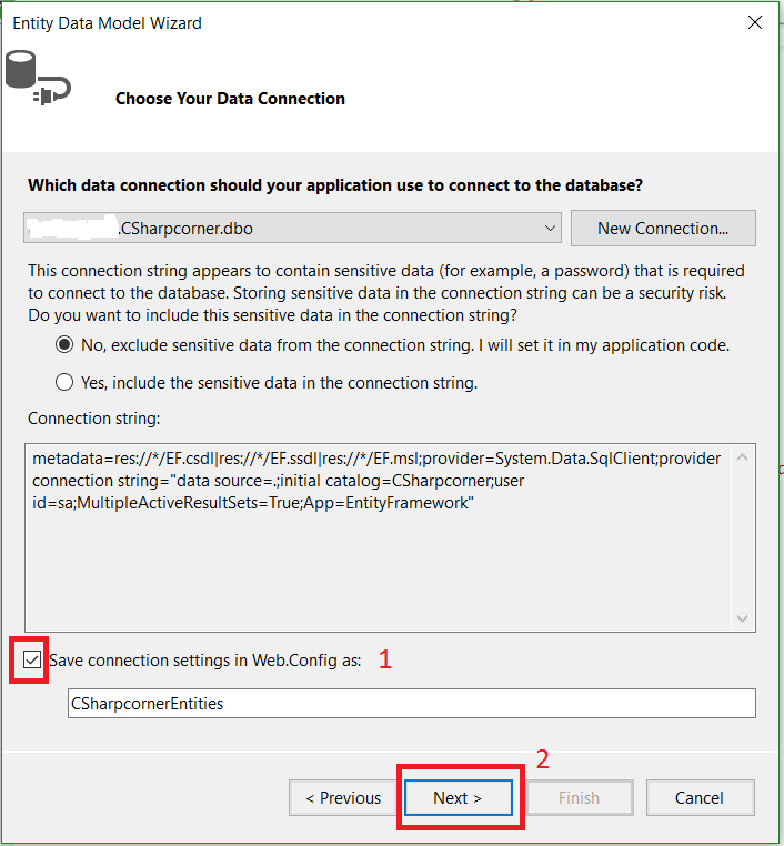 After creating connection, create a connection string for your application. Then, check the "Save connection settings in web.config.cs" option and click Next.