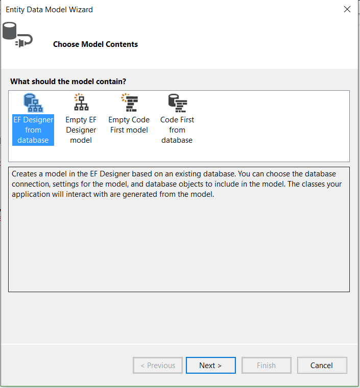 We already have the existing db, so we will move on to the Database first apporach model. To select the database first approach, select "EF Designer from database" and click Next
