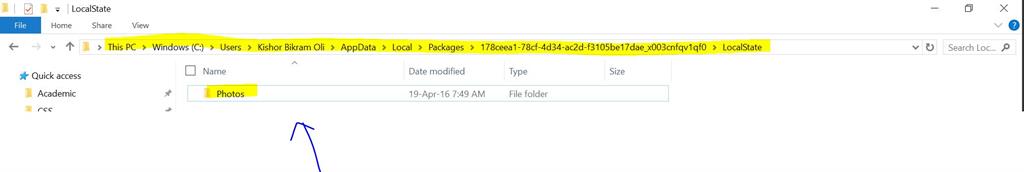 This PC, C, Users, [Your User Name], AppData, Local, Packages > [App package name]