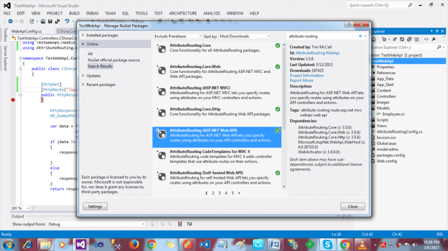 Go to Solution Explorer=> Right click=> click on "Manage NuGet packages" thereafter new window will open and type "AttributeRouting.Web.Http" in search textbox and press Enter. Afterwards, there are lot of libraries, which will be shown. See the image given below.