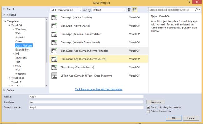 Select "New project" at the left side of Visual Studio. A pop up window listing out different projects will be opened. Select "Cross-Platform" at the left side and then, select Blank App (Xamarin.Forms Portable), as shown in the figure.
