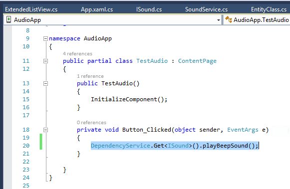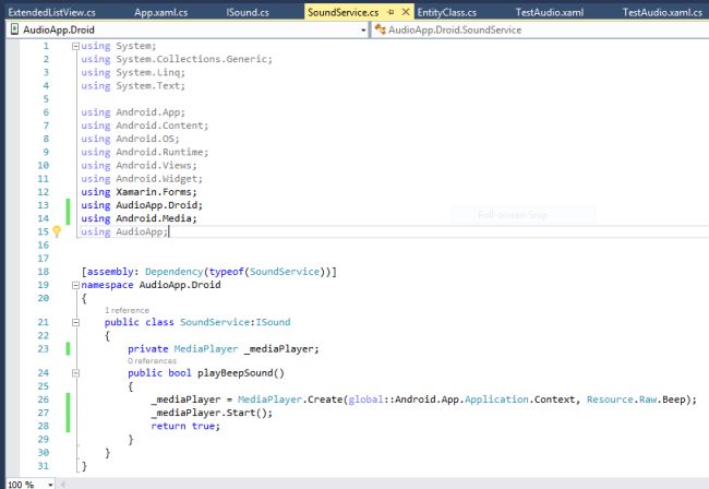 And, add "[assembly: Dependency(typeof(SoundService))]" above the namespace. The final code is shown in the screenshot below.