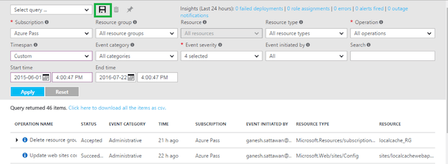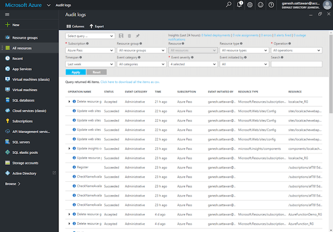 The above action opens the default view of Audit Logs blade as shown in below image. The data available here is the result of default filter selected in filter dropdowns.