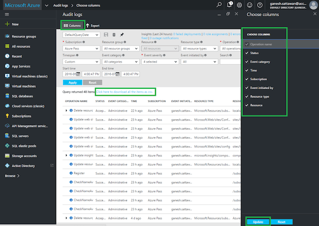 1. We can add or remove columns as per our requirement, as shown in the below image. Just click on the Columns button at the upper side. It opens the Choose columns blade where we select and deselect the columns. These are the columns (as seen in below image) provided at the time of writing this article. After selecting columns, click on Update button.