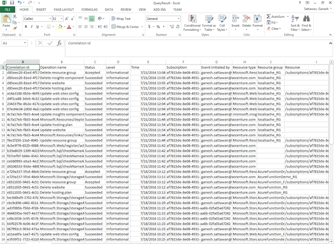 In the above image, you are seeing the filtered records exported in csv file which contains the columns as Correlation Id. it's unique for a single operation. As seen in the first record, I deleted the resource group for all other resources. Deletion of that resource group has the same Correlation Id.
