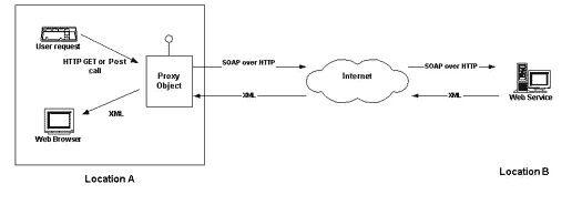 Therefore our code at Location A will instruct the proxy object. Then the proxy object will associate with the Location B Web service and produce the results to users at Location A. How do we do this ?