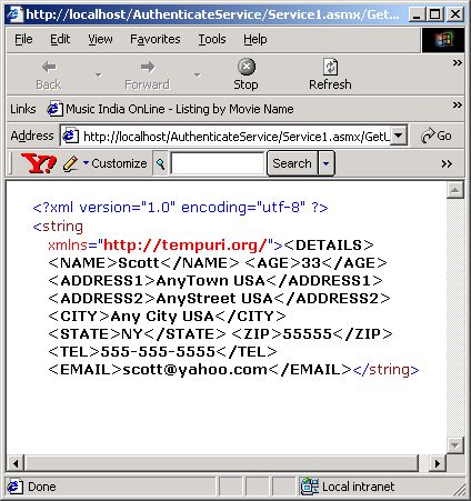 We are now ready to extract data from the Web Service. This proxy object will have the complete public interface for any business functions that we have exposed. Remember, we didn't even register the DLL. We just compiled the source code and stuck the DLL in the "bin" directory. This is sufficient to get access to the DLL by the Web server. You may be confused if you are not familiar with the deployment mechanisms in ASP.NET. We do not need to register a DLL in order to be recognized by the operating system. We just put it under the local "bin" directory and the .NET Framework will pick it up at run time.