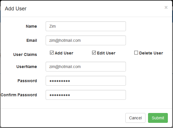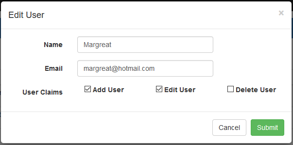 In this case the AddEditUser policy checks for the presence of an “Add User” and “Edit User” claims on the current identity.