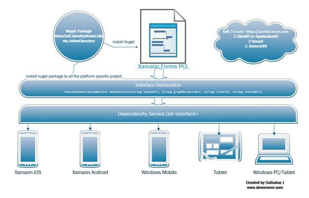 In a portable project, add a new interface for Authentication method. The authentication method will return Authentication result from ADAL, which contains the AccessToken and the user details .