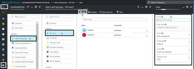 Create the user to access the application. Choose Azure Active Directory from the sidebar. Select Users and groups. Select All Users. Click on +Add and provide the user details, as shown below, where there is name of the user, user name (Email Id).