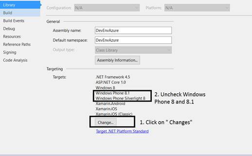 Right click on your PCL project > Click Properties > Go to the tab “Library” > You can see the list of the targeted platforms > Press the button “Change” > uncheck the target “Windows phone 8.1” and “ Windows phone Silvelight 8” > Press OK button.
