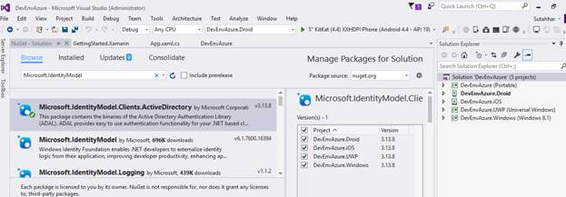 Select Solution => Right Click Manage nuget Packages for Solution => Search “Microsoft IdentityModel” => Select Microsoft.IdentityModel.Clients.ActiveDirectory => Select all Project => Click on Install