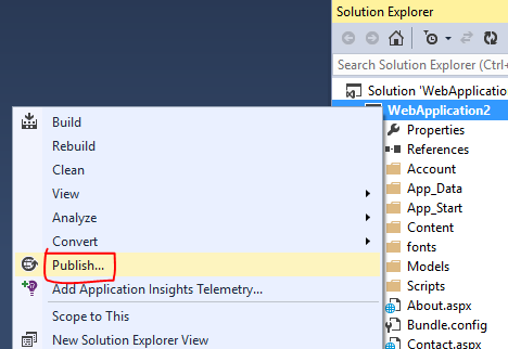 Open the Web Application that you would like to link the Web App in Visual Studio. Right click on the project and click on “Publish”.