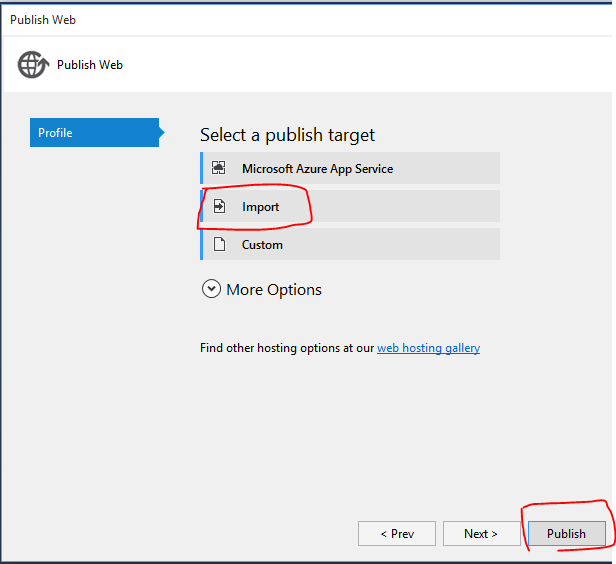 Settings Blade of the App Service Web App. Click on “Get Publish Profile” as shown below.
