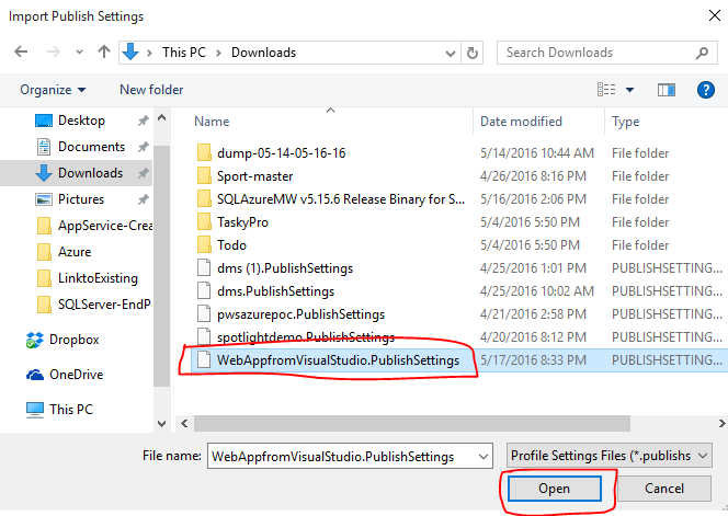 Clicking on the “Browse” button in the above screen, a windows will be opened as shown below. Please select the publish profile that we just downloaded.