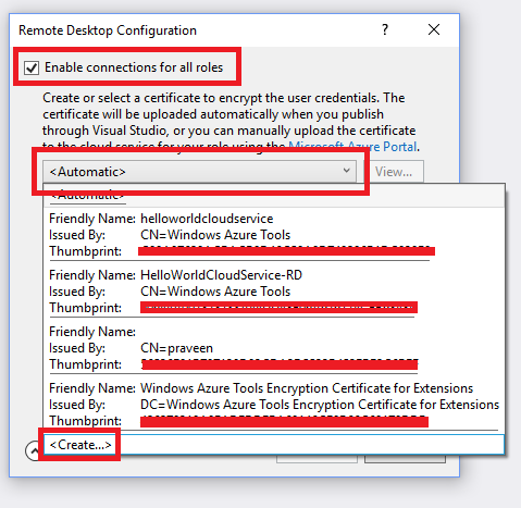 As shown in the above screen, enable the “Enable connections for all roles” checkbox and open the dropdown with the text “<Automatic>” which displays all the certificates that you have already created. Select “<Create…>” to create a new one, as shown in the below popup.