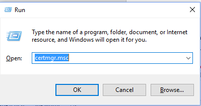 Visual Studio has created and installed a Certificate in the local Certificate repository. Let’s navigate to the Certificate repository typing “certmgr.msc” in the run command (Windows + R), as shown below.